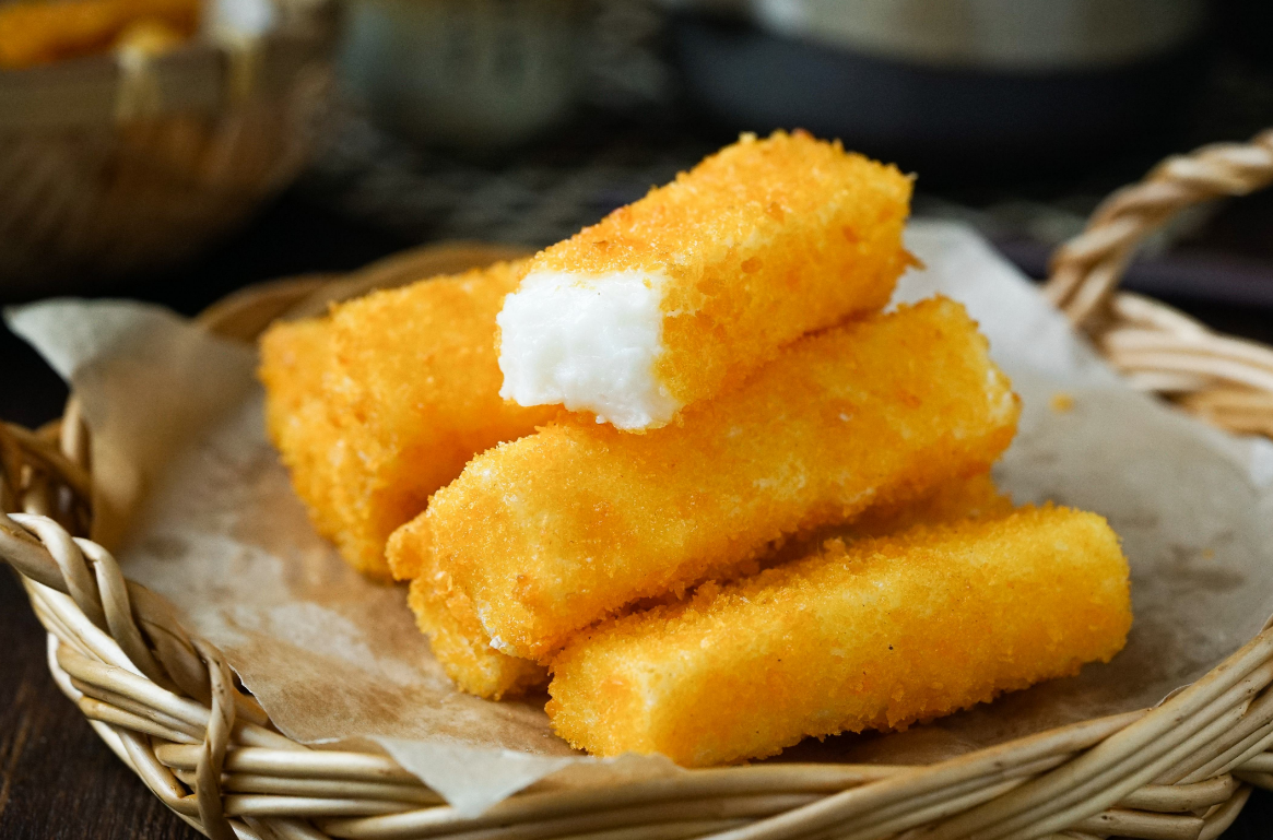 第七步:牛奶條先裹上一層淀粉,再裹上蛋液,面包糠里轉(zhuǎn)一圈(這個(gè)過程最好用手進(jìn)行,用筷子容易夾碎)