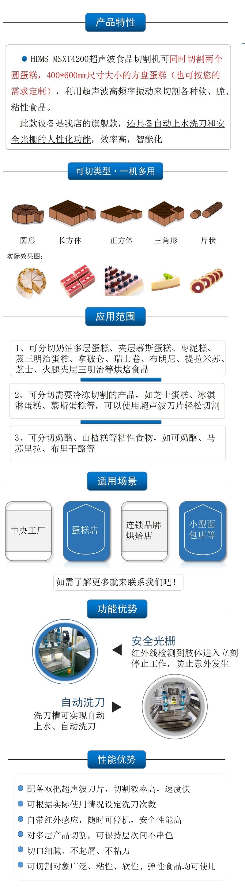 該設(shè)備配備雙把超聲波刀片,既可切方蛋糕,也可同時切兩個圓蛋糕,效率更高