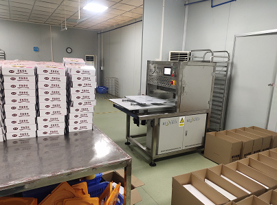 A small production line with conveyor; For slicing only; Good choice for slicing frozen dough, cake rolls, and so on. |