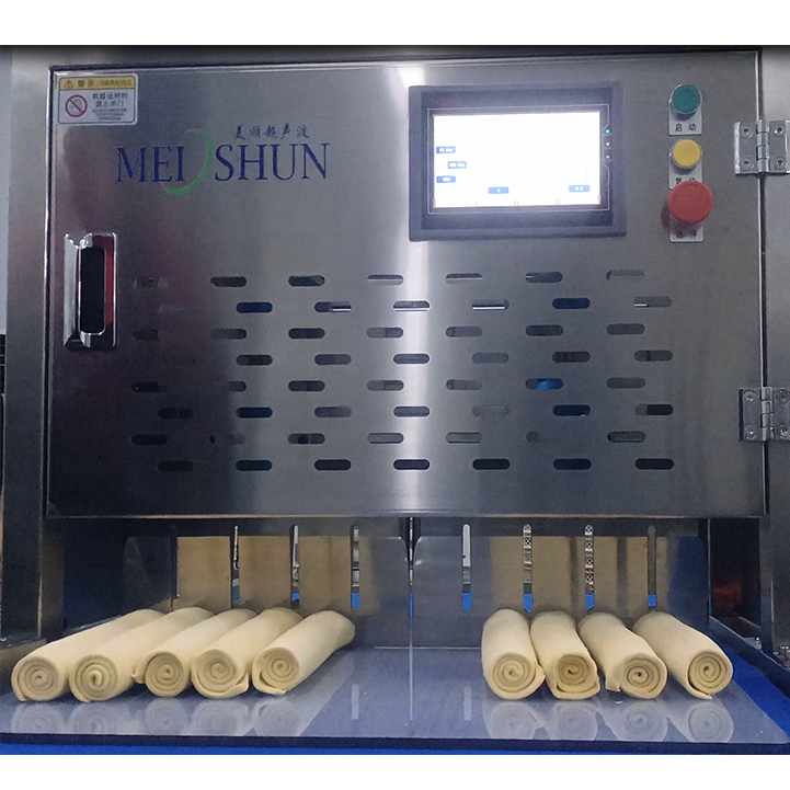 Ultrasonic cutting machine uses high-frequency vibration to carry out cutting work. The equipment realizes friction-free and pressure-free cutting mode. Meishun Machinery can provide a complete set of cutting solutions for bakeries of any size, and can customize each machine according to customer needs. This machine is applicable to central factories, cake shops and chain bakeries.